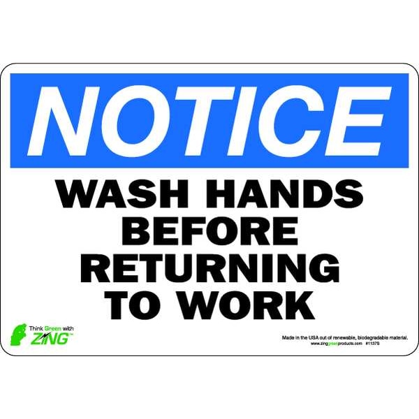 Notice Sign, Sign Subject Matter Wash Hands, Height 7 in, Width 10 in, Sign Material Polyester, Sign Mounting Style Adhesive Surface, Header NOTICE, Legend Wash Hands Before Returning To Work, Printed Language English, Sign Shape Rectangle