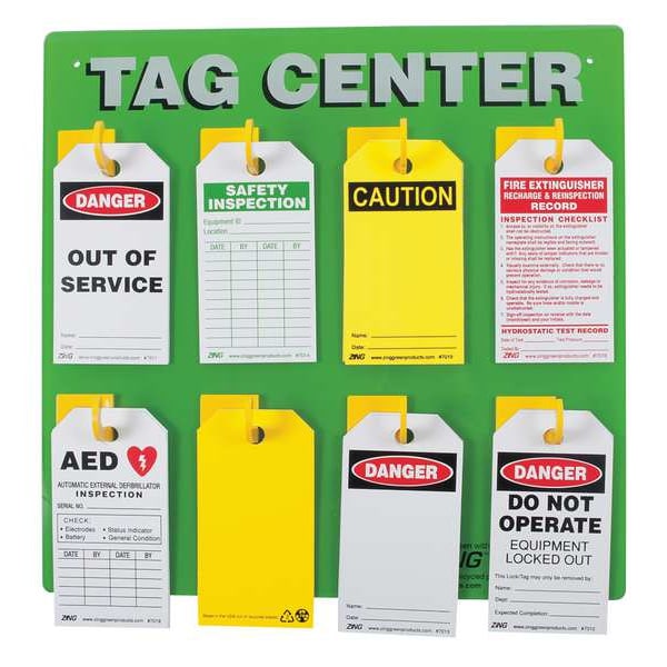 Tag Center with 8 Hooks, Cable Lockouts Included Not Applicable, Cover Type Open Front, Electrical Lockouts Included Not Applicable, Filled No, Number of Hasps Included 0, Number of Lockouts Included 0, Number of Padlocks Included 0, Number of Tags Included 0, Visibility Inside Board Only, Language English, Background Color Green, Legend Tag Center, Legend Type Text, Material Plastic, Mounting Location Wall, Number of Compartments 0, Number of Hooks 8, Overall Depth 2.5 in, Overall Height 15 in