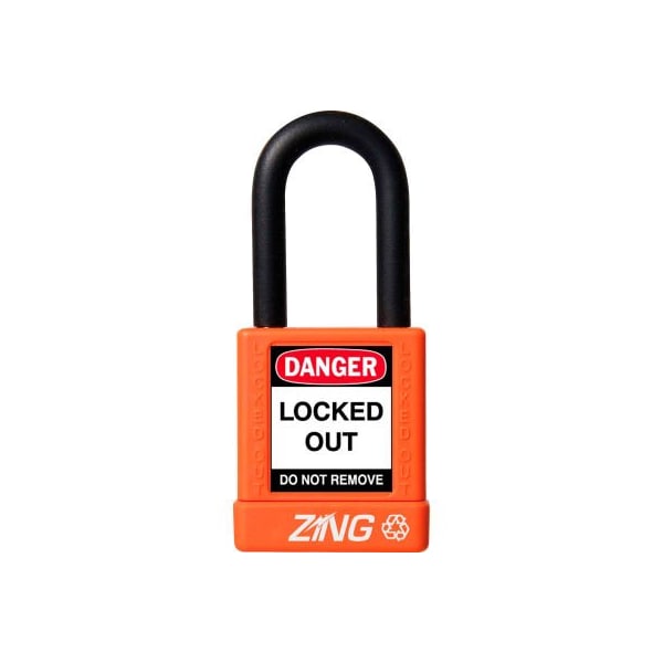 Zing recyclock safety padlock, keyed alike, 1-1/2" shackle, 1-3/4" body, orange, 7043 zing recyclock padlock, keyed alike, includes one key, solid aluminum body with fully insulated protective covering, precision 6-pin cylinder has key-retaining and auto-locking functions, made from high quality 70% recycled materials, ul validated for recycled content, contains no pvc and uses food industry approved lubricants, padlock body is red with trilingual label, body measures 1-3/4" length x 1-1/2" wide, steel shackle measures 1-1/2" length x 1/4" dia.