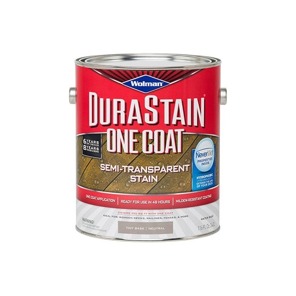 Wolman Durastain, Gallon, Neutral Base, 1 Coat SemiTransparent Stain, Water Based Exterior Wood Stain Designed To Provide Excellent Color Retention, Adhesion Protection Against UV Graying, Water Damage Mildew In 1 Coat, Decorates Wood With A Deeply Pigmented Color In A Matte Finish That Enhances Wood Texture Provides SemiTransparent Hide, Coverage Over New Or Previously Coated, Weathered Wood, Never Wet Hydrophobic Technology Properties Superior Water Repellency Helps Maximize Resistance To Wood Cracking, Checking, Splitting Warping, Beautifies Protect Decks, Porches, Fences, Shake, Shingle Clapboard Siding, Boat Decks, Boardwalks, Outdoor Furniture, Gazebos, Arbors Trellises, Storage Sheds More, 250 SQFT Per Gallon 1 Coat