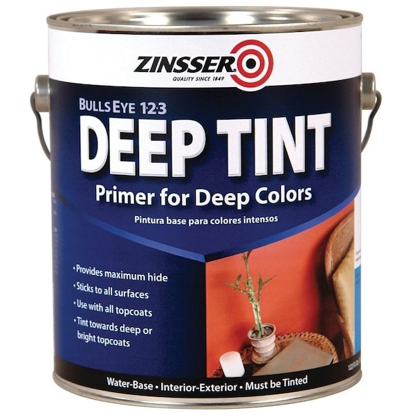 Zinsser Bulls-Eye 1-2-3 Deep tint is a white pigmented, styrenated acrylic water- base deep tint capable primer sealer stain blocker and bond coat designed for priming all surfaces. Apply to interior and exterior walls, ceilings, doors, trim, fascia, soffits, foundations, railings and related paintable surfaces. Bulls-Eye 1-2-3 deep tint bonds to wood, plaster, concrete, gloss enamels, hardboard, glass and tile. It provides a rust inhibitive coating on iron railings, steel frames, piping. It resists the growth of mold and mildew in damp, humid environments. It resists high pH surfaces up to 12.5 and seals most porous surfaces. Bulls-Eye 1-2-3 deep tint traps most stains in the primer film including graffiti, grease, rust, cedar and redwood tannin, creosote and asphalt stains.