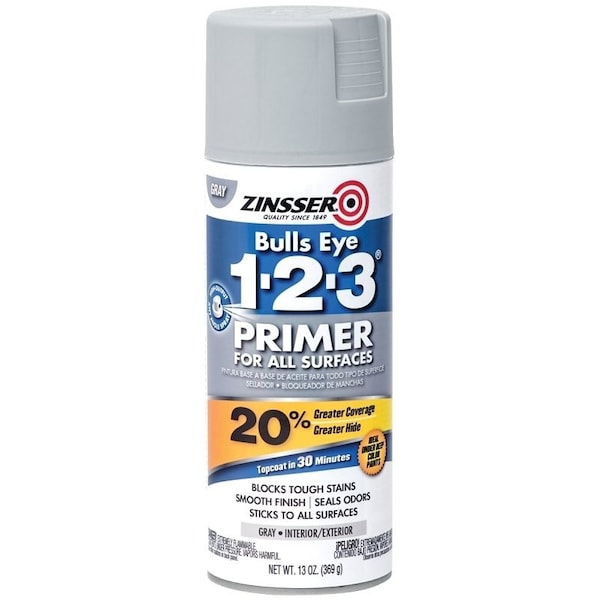 Zinsser Bulls-Eye 1-2-3 Gray primer is an all purpose, high performance, water-based primer for interior and exterior residential, commercial and industrial applications. Bulls-Eye 1-2-3 Gray primer has excellent stain blocking resistance, is fast dry and has excellent adhesion to glossy surfaces. Use Bulls-Eye 1-2-3 Gray primer with rich or dark topcoat colors to improve their hide and coverage. May be used under and over any oil or latex architectural paint. The dried film is mold-and mildew-resistant.