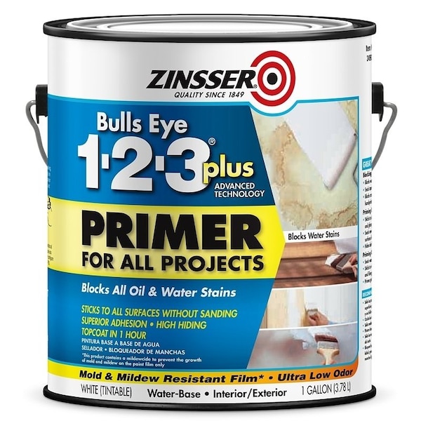 Zinsser Bulls-Eye 1-2-3 Plus Primer is an all-purpose, all-surface water-based, interior/exterior primer that features all the performance characteristics of oil-based primers. It features low-odor, low-VOC, has excellent stain blocking resistance is fast dry, has excellent flow and leveling and excellent adhesion to glossy surfaces. The dried film is mold and mildew resistant.