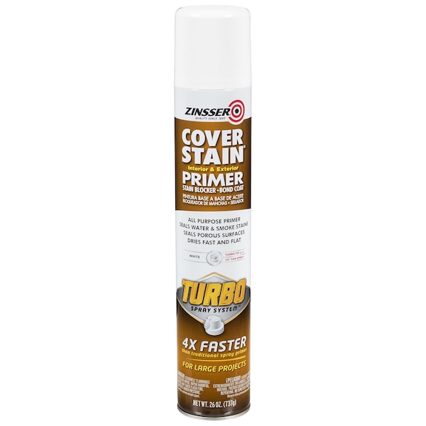 Zinsser cover stain turbo white is an interior/exterior primer and sealer spray that will stick to any surface without sanding and can be used under and over oil and latex topcoats. It features an oil-based formula that seals stains from water, smoke, fire, nicotine and tannin bleed. Prime large objects in no time with a powerful spray that provides professional spray equipment results without the cleanup.
