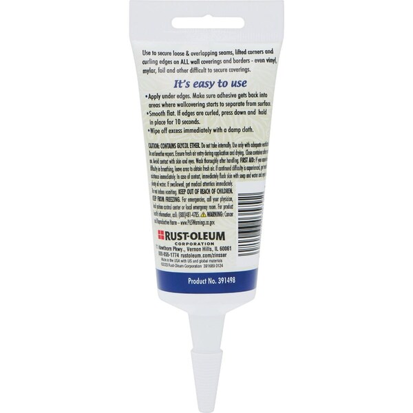 An all-purpose clear latex adhesive to form a strong bond on loose or curling seams of wallcovering and borders. Ideal for use with wallpaper fabrics crafts vinyl plaster and wood. This product has excellent wet tack and adhesion for overlapping vinyl and fastening loose edges. Easy water clean up. Convenient 2 fl. oz squeeze tube.