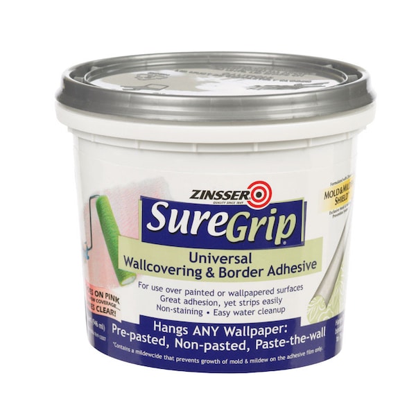Zinsser SureGrip Universal Border Adhesive hangs pre-pasted, non-pasted and paste-the-wall (non-woven) borders over any wallpapered or painted surface. SureGrip has a revolutionary mildew-resistant formula which provides excellent adhesion while making removal easy later.