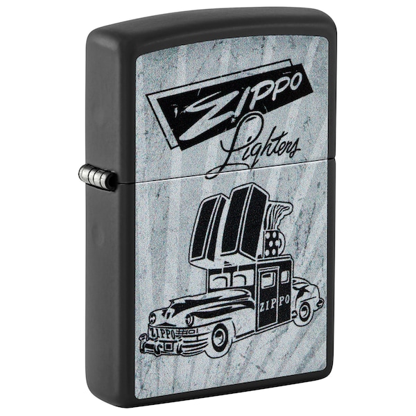 This retro-inspired design is right at home on a Black Matte lighter. A vintage Zippo logo is anchored by the iconic Zippo car in this monochromatic Color Image design. Comes packaged in a gift box.