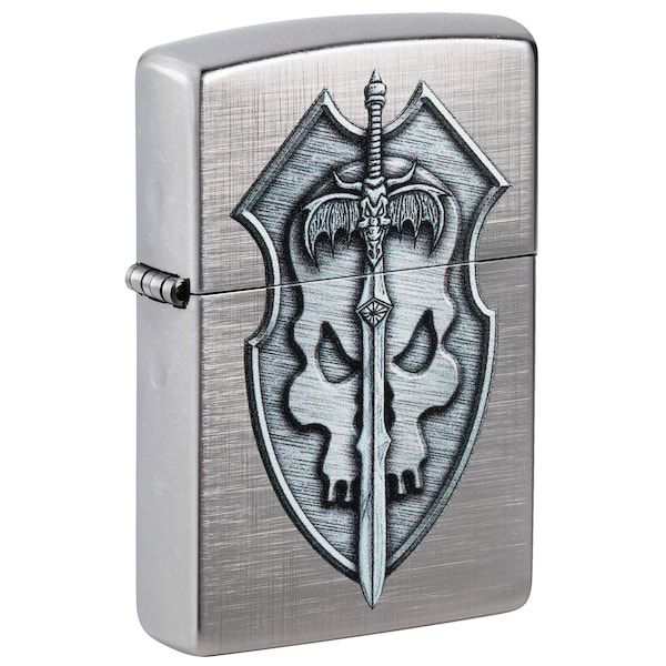This rugged Linen Weave lighter is battle-ready. The intricate Color Image design depicts a three-dimensional-looking shield made more menacing by its prominent skull and sabre. Comes packaged in a gift box. For optimal performance fill with Zippo lighter fuel.