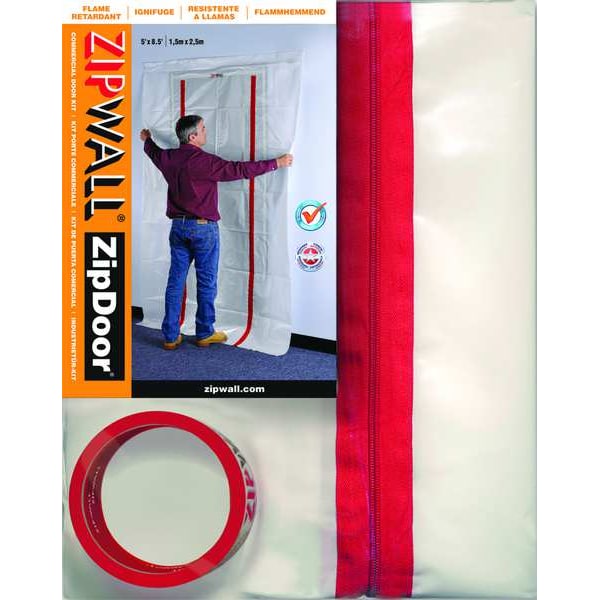 Dust Barrier Door, Commercial, Material Plastic, Height 8.5 ft, Closure Length 8 1/2 ft, Width 5 ft, Color Clear, Includes (2) Flap Hooks, Roll of Tape, Zippered Door, For Use With Commercial Door, Closure Type Zipper, Features Airtight, Flap Hooks Hold Door Open for Easy Access, Heavy-Duty Zippers are Preinstalled, Quick and Easy to Install, Significant Time Saver on Large Jobs, Zipwall Double-Sided Tape Securely Holds the Door Panel While Protecting the Doorframe Surface