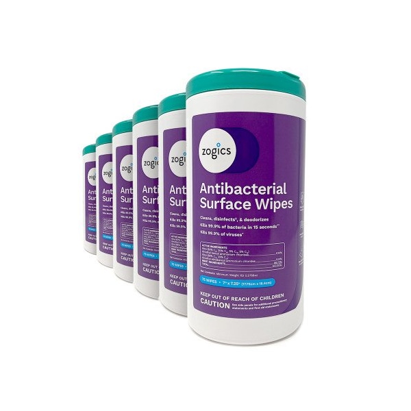 Powerful Protection: 75-Count Antibacterial Wipes CanisterWhen only the best protection will do, Zogics 75-Count Antibacterial Wipes deliver fast-acting disinfecting power. These EPA-registered antibacterial wipes eliminate 99.9% of bacteria in just 15 seconds, including MRSA, HIV-1, H1N1, E. coli, and more. Free from bleach, alcohol, and phenol, these wipes are safe yet effective, offering superior cleaning in gyms, healthcare settings, nursing homes, veterinary clinics, schools, shopping centers, grocery stores, and other high-traffic areas.Portable Antibacterial Disinfecting Wipes for Gyms, Offices, and SchoolsThe 75-wipe canister is the ideal size for on-the-go disinfecting, keeping spaces clean and safe with minimal hassle. Each wipe measures 7'' x 7.25'', providing generous coverage for quick cleaning on hard surfaces. These wipes are perfect for use in smaller spaces, personal training areas, classrooms, retail checkout counters, and employee desks-anywhere that requires reliable sanitation within reach.Cost-Effective Antibacterial Wipes for High-Traffic SpacesSmaller canisters allow placement in key areas where frequent cleaning is essential. With less waste and efficient distribution, these 75-count canisters help reduce costs while maintaining hygiene standards across multiple locations. Keep every area protected with portable antibacterial wipes designed for frequent use in high-traffic environments without the bulk.Product Highlights:Premium quality disinfecting wipeAlcohol-free, solvent-free and bleach-free wipesAntibacterial Wipes kill 99.9% of bacteria in just 15 secondsKills SARS-CoV-2 on hard, non-porous surfaces in 30 secondsKills HIV-1Kills Antibiotic Resistant Bacteria: MRSA, VISA and VREKills Flu VirusKills Pandemic 2009 H1N1 Influenza A Virus formerly called Swine Flu