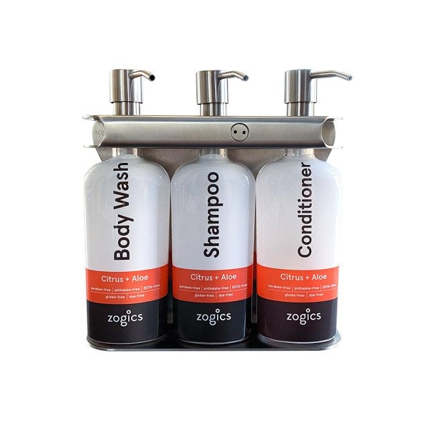 Triple Amenity Fixture, Zogics Citrus + AloeThis triple amenity dispenser system is a great option for guest rooms as it has a sleek and unobtrusive design. Constructed of durable, rust-resistant stainless steel, the dispenser has a thin 1.5 profile that fits seamlessly into the room's aesthetic. Additionally, the dispenser features a patented tamper-resistant locking system that ensures safety and security by only allowing staff access to the products. Each set includes 1 fixture, 6 bottles, 6 pumps with Zogics Citrus + Aloe body care labels, a locking key, and mounting tape. Two sets of bottles are provided for your convenience so that one is always in the room and one is always ready for use in housekeeping.