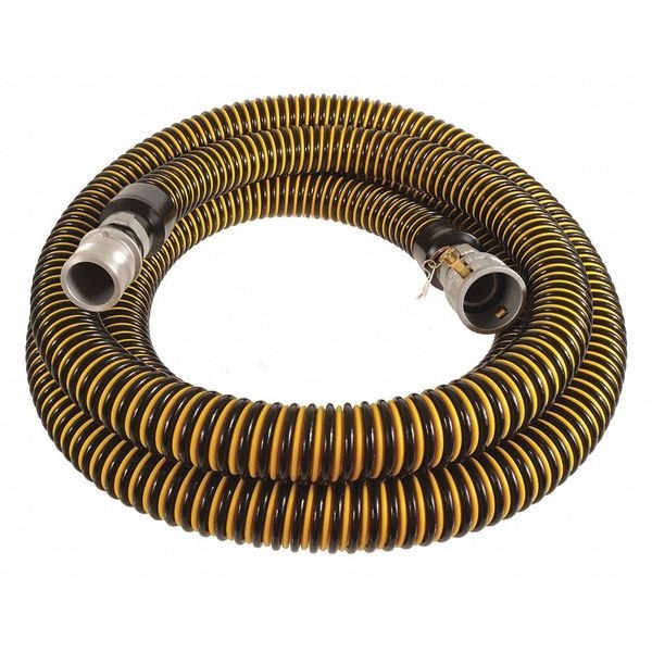 Water Suction Hose, Hose Inside Dia. 1 1/2 in, Hose Length 20 ft, Hose Color Black, Yellow, Hose Tube Material Polyethylene, Hose Cover Material Polyethylene, Max. Working Pressure @ 70 F 26 psi, Temp. Range -40 Degrees to 140 Degrees F, Bend Radius 3 7/8 in, Hose Fitting A Size 1 1/2 in, Hose Fitting B Size 1 1/2 in, Hose Fitting A Material Aluminum, Hose Fitting B Material Aluminum, Hose Fitting A Type Cam and Groove C, Hose Fitting B Type Cam and Groove E, Hose Configuration Coupled Assembly