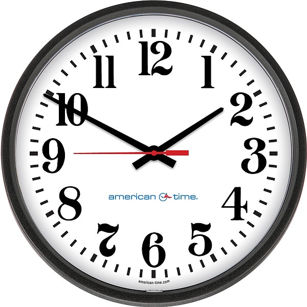 Clock, Times Face Style, 12 Hour, Overall Dia. 13-1/8 In., Depth 2-1/4 In., Power Source (1)AA Battery, Mount Wall or Surface, Case Material Plastic, Case Color Black, Lens Material Impact-Resistant Plastic