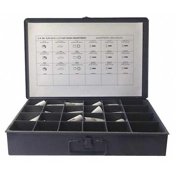 Hex Head Cap Screw Assortment, Metal Box, Container Material Metal, Stainless Steel, Black Oxide, Flat Washers Included (50) 1/4 in, (50) 3/8 in, (50) 5/16 in, Hex Nuts Included Hex Nuts: (50) 1/4 In.-20, (50) 5/16 In.-18, (50) 3/8 In.-16, Lock Nuts (50) 1/4 In.-20, (50) 5/16 In.-18, (50) 3/8 In.-16, Lock Washers Included Lock Washers Not Included