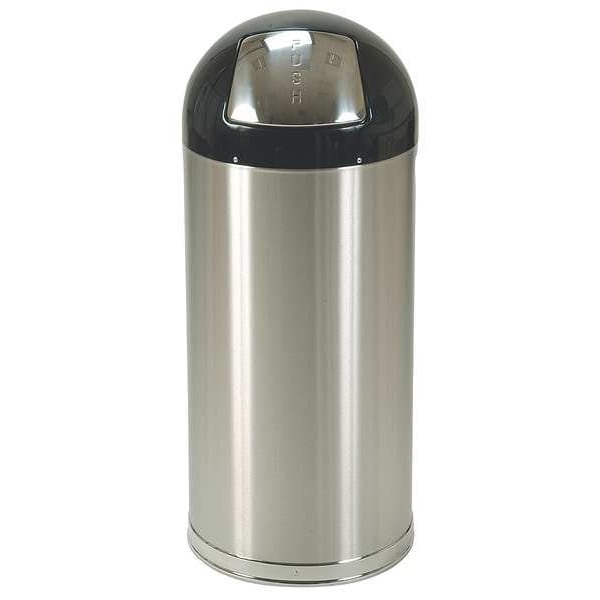 Fire-Resistant Trash Can, Round, Dome with Push Door, 15 gal, Silver, Height 36 1/2 in, Width/Diameter 15 1/4 in, Depth Not Applicable, Metal, Steel, Brushed, Indoor/Outdoor, Stationary, Lid Included, Hinged, None, Free-Standing