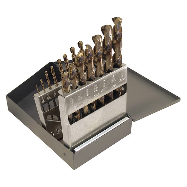 Jobber Length Drill Bit Set, Number of Drill Bits 15, Drill Bit Point Angle 135 Degrees , Material - Machining Cobalt, Finish - Machining Straw/Bronze