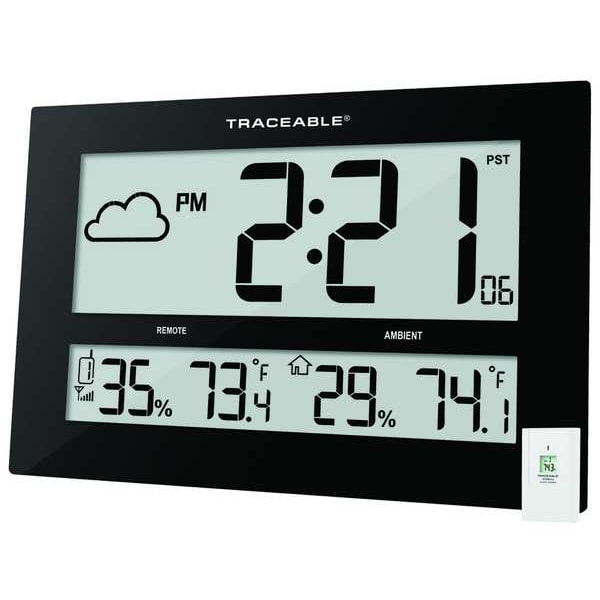 Radio Atomc Clock, Digital, 12 Hour, 24 Hour, Shape Rectangle, Width 16-1/2 In., Depth 1-1/4 In., Height 10-1/2 In., Digit Size 4-3/4 In., Power Source (2)AA Batteries, Mount Surface, Features 4-3/4 In. digit size, Case Material ABS Plastic, Case Color White, Face Color Gray, Lens Material Glass, Includes Traceable(r) Certification