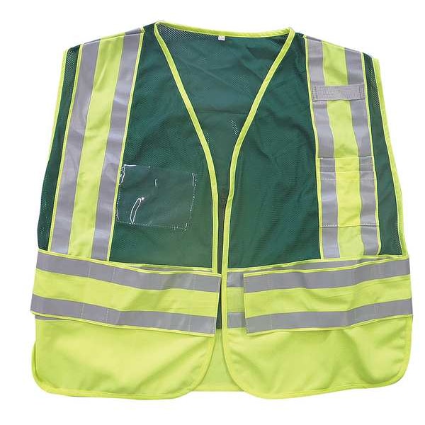 Safety Vest, Green, No Legend, Unrated, Vest Size 4XL, Vest Closure Type Zipper, Vest Material Polyester, Fits Chest Size 52 in to 64 in, Vest Length 23 in, Stripe Color Silver, Standards ANSI 207-2006, Includes Left Chest Mic Tab, Adjustable Sides, Folds Into Storage Pouch