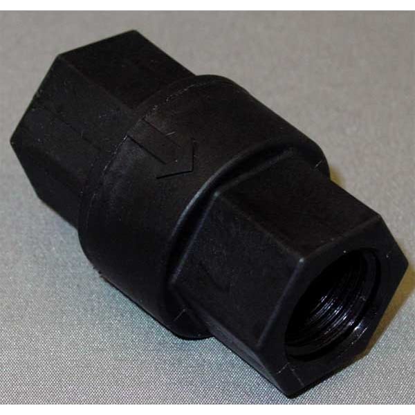 Item - Check Valves Check Valve, Flow Design Single, Mechanism and Body Design Inline Ball Cone, Body Material - Valves Glass Filled Polypropylene, Pipe or Tube Size 3/8 in, Connection Type FNPT x FNPT, Cracking Pressure 0.33 psi, Mounting Orientation Horizontal, Vertical, Seal Material Buna-N, Max. Temp. - Valves 140 Degrees F, Min. Temp. - Valves -20 Degrees F, Max. Water Pressure - Valves 125 psi, Max. Steam Pressure - Valves Not Rated, Seat Material Glass Filled Polypropylene