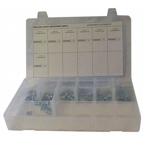 Machine Screw Assortment, Finish Plain, Head Type Pan, Drive Phillips, Number of Sizes 7, Number of Pieces 88, Material Steel, Pack Size Small, System of Measurement Inch, Container Material Plastic, Head Style Pan, Includes (20) Each: 6-32 x 1/2 in, (15) Each: 8-32 x 1/2 in, x3/4 in, (12) Each: 10-24 x 1/2 in, x3/4 in, (8) Each: 1/4 In.-20 x 3/4 in, (6) Each: 1/4 In.-20 x 1 in, Plastic Case, Includes Flat Washers Flat Washers Not Included, Includes Hex Head Screws Hex Head Screws Not Included