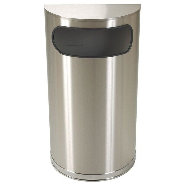 Wastebasket, Half-Round, Flat with Side Opening, 9 gal, Silver, Height 32 1/4 in, Width/Diameter 17 3/4 in, Depth 8 3/4 in, Metal, Stainless Steel, Satin, Indoor/Outdoor, Stationary, Lid Included, Lift Up, None, Free-Standing