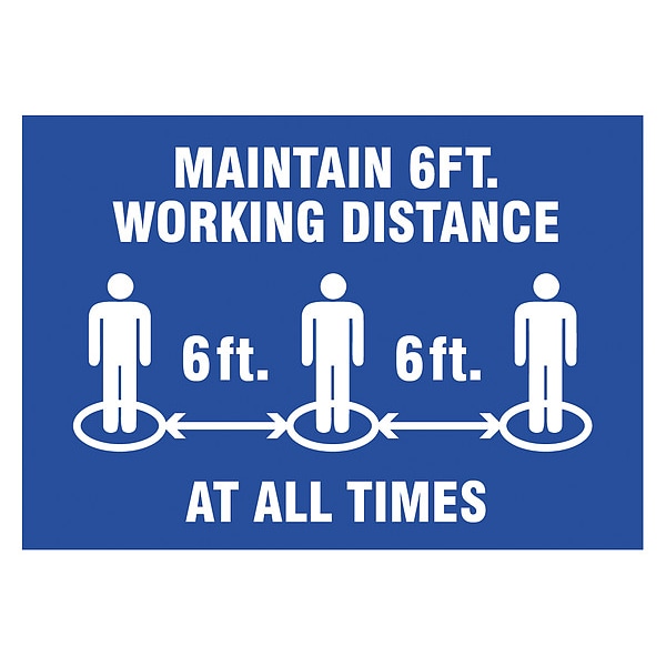 Adhesive Safety Sign, Sign Subject Matter Social Distancing, Height 7 in, Width 10 in, Sign Material Vinyl, Sign Mounting Style Adhesive Surface, Header No Header, Legend Maintain 6 Ft. Working Distance At All Times, Printed Language English