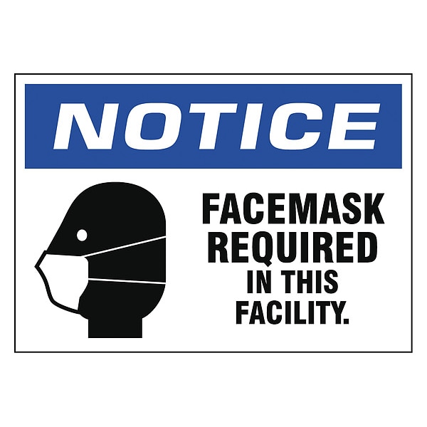 Adhesive Safety Sign, Sign Subject Matter Coronavirus Prevention, Height 7 in, Width 10 in, Sign Material Vinyl, Sign Mounting Style Adhesive Surface, Header Notice, Legend Facemask Required In This Facility., Printed Language English