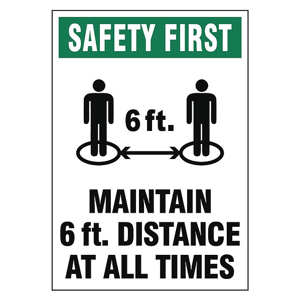 Adhesive Safety Sign, Sign Subject Matter Social Distancing, Height 10 in, Width 7 in, Sign Material Vinyl, Sign Mounting Style Adhesive Surface, Header Safety First, Legend Maintain 6 Ft. Distance At All Times, Printed Language English