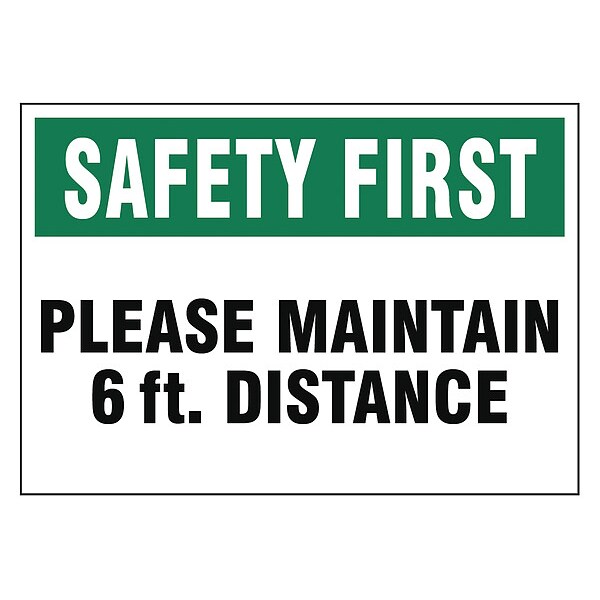 Adhesive Safety Sign, Sign Subject Matter Social Distancing, Height 7 in, Width 10 in, Sign Material Vinyl, Sign Mounting Style Adhesive Surface, Header Safety First, Legend Please Maintain 6 Ft. Distance, Printed Language English