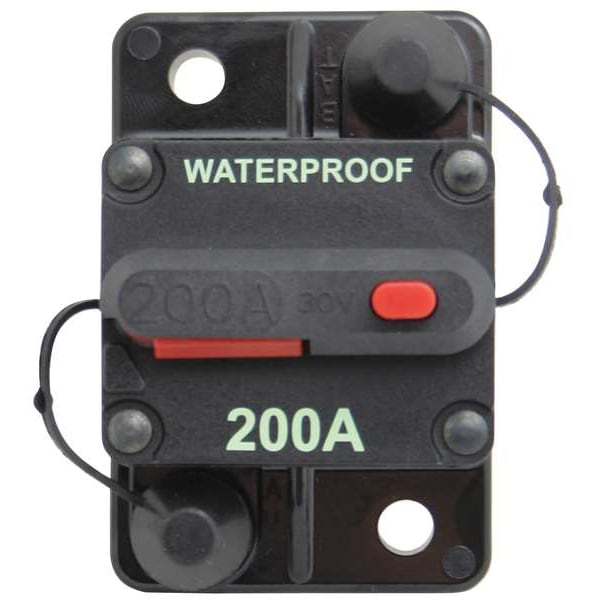 Automotive Circuit Breaker, Mount Type Plug In, Mount Style Flush, Current Rating 200 A, Voltage Rating 30V DC, Interrupt Rating 3 kA at 30V DC, Terminal Connection Stud, Circuit Breaker Type Automotive Circuit Breaker, Compatible Product Type Auxiliary and Accessory Circuits, Compatible Vehicle Type Buses, Boats, RVs, Trucks, Housing Material Phenolic Molding Compound, Overall Depth 2 15/16 in, Overall Height 1 3/4 in, Overall Width 1 15/16 in, Reset Type Manual, Series 5RLT, Stud Size 1/4 In.