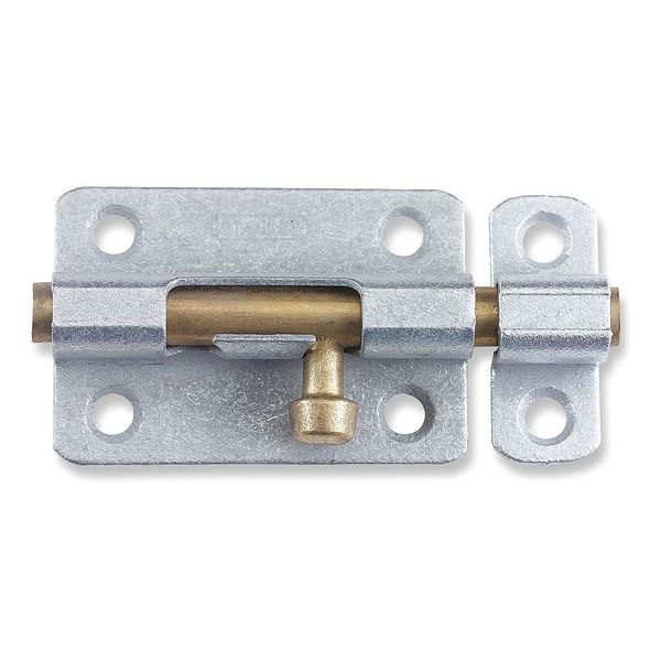 Door Bolt, Operation Type Hand Pull, Galvanized Finish, Material Steel, Length 2 1/2 in, Width 1 7/16 in, Height 1/2 in, Bolt Length 2 1/2 in, Bolt Head Dia. 5/16 in, Throw Size 1/2 in, Chain Length Not Applicable, Holes per Leaf 6, Hardware Included