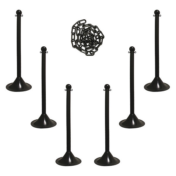 Barrier Post Kit, Number of Posts 6, Post Height 41 in, Number of Chains 1, Chain Length 50 ft, Link Outside Length 1.9 in, Link Outside Width 1.1 in, Base Type Dome, Chain Color Black, Post Color Black, Reflectivity Non-Reflective, Includes (6) Light Duty Stanchions, 50 ft of 2 in Plastic Chain, Post Diameter 2 in, Fillable Yes, Base Diameter 14 in, Base Weight 16 lb, Post Finish Matte, Base Color Black, Post Material Plastic, Chain Material Plastic, Base Material HDPE, Base Finish Gloss