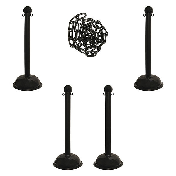 Barrier Post Kit, Number of Posts 6, Post Height 41 in, Number of Chains 1, Chain Length 30 ft, Link Outside Length 2.9 in, Link Outside Width 1.7 in, Base Type Dome, Chain Color Black, Post Color Black, Reflectivity Non-Reflective, Includes (4) Heavy Duty Stanchions, 30 ft of 2 in Plastic Chain, Post Diameter 3 in, Fillable Yes, Base Diameter 16 in, Base Weight 20 lb, Post Finish Matte, Base Color Black, Post Material Plastic, Chain Material Plastic, Base Material HDPE, Base Finish Gloss
