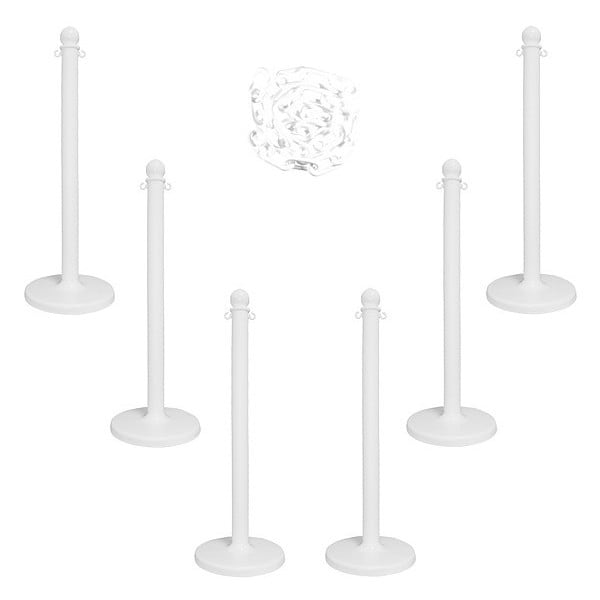 Barrier Post Kit, Number of Posts 6, Post Height 40 in, Number of Chains 1, Chain Length 50 ft, Link Outside Length 1.9 in, Link Outside Width 1.1 in, Base Type Flat, Chain Color White, Post Color White, Reflectivity Non-Reflective, Includes (6) Medium Duty Stanchions, 50 ft of 2 in Plastic Chain, Post Diameter 2 1/2 in, Fillable Yes, Base Diameter 14 in, Base Weight 22 lb, Post Finish Matte, Base Color White, Post Material Plastic, Chain Material Plastic, Base Material HDPE, Base Finish Gloss
