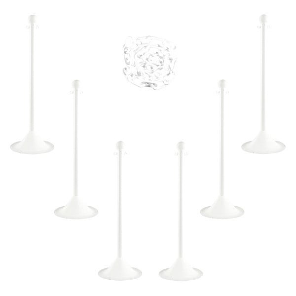 Barrier Post Kit, Number of Posts 4, Post Height 41 in, Number of Chains 1, Chain Length 50 ft, Link Outside Length 1.9 in, Link Outside Width 1.1 in, Base Type Dome, Chain Color White, Post Color White, Reflectivity Non-Reflective, Includes (6) Light Duty Stanchions, 50 ft of 2 in Plastic Chain, Post Diameter 2 in, Fillable Yes, Base Diameter 14 in, Base Weight 16 lb, Post Finish Matte, Base Color White, Post Material Plastic, Chain Material Plastic, Base Material HDPE, Base Finish Gloss