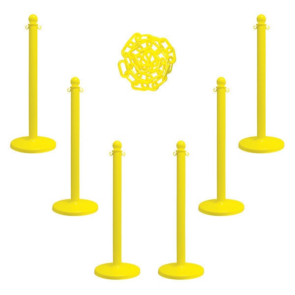 Barrier Post Kit, Number of Posts 6, Post Height 40 in, Number of Chains 1, Chain Length 50 ft, Link Outside Length 1.9 in, Link Outside Width 1.1 in, Base Type Flat, Chain Color Yellow, Post Color Yellow, Reflectivity Non-Reflective, Includes (6) Medium Duty Stanchions, 50 ft of 2 in Plastic Chain, Post Diameter 2 1/2 in, Fillable Yes, Base Diameter 14 in, Base Weight 9 lb, Post Finish Matte, Base Color Yellow, Post Material Plastic, Chain Material Plastic, Base Material HDPE, Base Finish Gloss