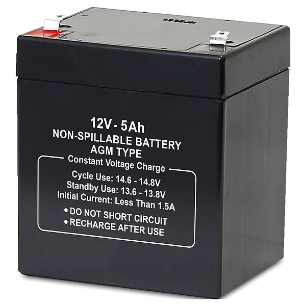 Sealed Lead Acid Battery, Battery Design AGM, Voltage - Batteries 12V DC, Capacity - Batteries 5 Ah, Terminal Type - Batteries Faston, Height 3.98 in, Width 3.54 in, Depth 2.76 in, Housing Material - Batteries ABS, Battery Cycle Type Deep Cycle, Terminal Location Top, Application Consumer Electronics, Electric Vehicles, Emergency Lighting, Golf Carts, Hunting, Lawn and Garden, Medical Mobility, Motorcycles, Portable Tools, Powersports, Security, Solar, Toys, For Use With All Purpose