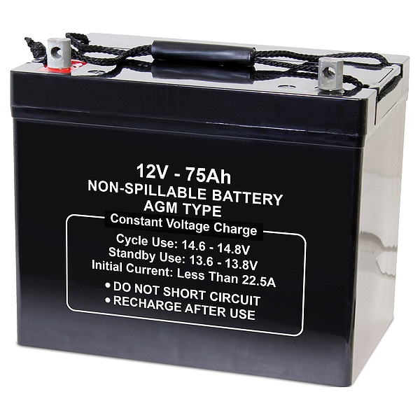 Sealed Lead Acid Battery, Battery Design AGM, Voltage - Batteries 12V DC, Capacity - Batteries 75 Ah, Terminal Type - Batteries Tab with Bolt Hole, Height 8.27 in, Width 6.61 in, Depth 10.24 in, Housing Material - Batteries ABS, Battery Cycle Type Deep Cycle, Terminal Location Top, Application Consumer Electronics, Electric Vehicles, Emergency Lighting, Golf Carts, Hunting, Lawn and Garden, Medical Mobility, Motorcycles, Portable Tools, Powersports, Security, Solar, Toys