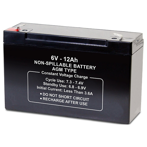 Sealed Lead Acid Battery, Battery Design AGM, Voltage - Batteries 6V DC, Capacity - Batteries 12 Ah, Terminal Type - Batteries Faston, Height 3.7 in, Width 1.97 in, Depth 6 in, Housing Material - Batteries ABS, Battery Cycle Type Deep Cycle, Terminal Location Top, Application Consumer Electronics, Electric Vehicles, Emergency Lighting, Golf Carts, Hunting, Lawn and Garden, Medical Mobility, Motorcycles, Portable Tools, Powersports, Security, Solar, Toys, For Use With All Purpose