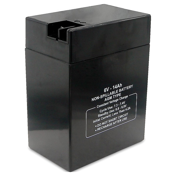 Sealed Lead Acid Battery, Battery Design AGM, Voltage - Batteries 6V DC, Capacity - Batteries 14 Ah, Terminal Type - Batteries Faston, Height 5.51 in, Width 2.82 in, Depth 4.25 in, Housing Material - Batteries ABS, Battery Cycle Type Deep Cycle, Terminal Location Top, Application Consumer Electronics, Electric Vehicles, Emergency Lighting, Golf Carts, Hunting, Lawn and Garden, Medical Mobility, Motorcycles, Portable Tools, Powersports, Security, Solar, Toys, For Use With All Purpose