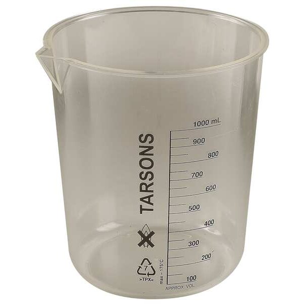 Beaker, Capacity - Metric 1 L, Capacity - English 33.81 fl oz, Product Type Beaker, Beaker Type Low Form, Outside Diameter - Metric 140 mm, Overall Height - Metric 150 mm, Body Material Polymethylpentene, Includes Graduations Yes, Glassware Class Not Rated, Body Color Clear, Graduation Increments - Metric 50 mL, Autoclavable Yes, Clarity Transparent, Basic Material Plastic, Disposable/Reusable Reusable, Sterile/Non-Sterile Non-Sterile, Maximum Graduation - Metric 1,000 mL