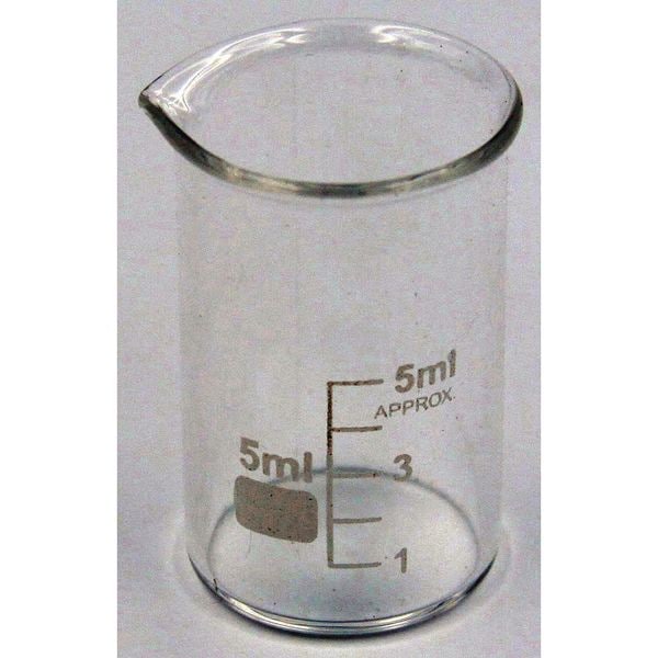 Beaker, Capacity - Metric 5 mL, Capacity - English 0.2 fl oz, Product Type Beaker, Beaker Type Low Form, Outside Diameter - Metric 22 mm, Overall Height - Metric 35 mm, Body Material Glass, Includes Graduations Yes, Glassware Class Not Rated, Body Color None, Graduation Increments - Metric 1 mL, Autoclavable Yes, USP Specification Not Applicable, Clarity Transparent, Basic Material Glass, Special Features Pour Spout, Disposable/Reusable Reusable, Sterile/Non-Sterile Non-Sterile