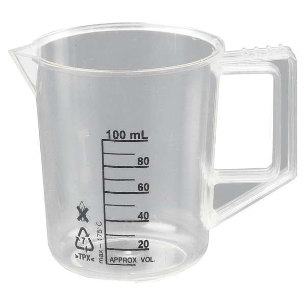 Beaker, Capacity - Metric 100 mL, Capacity - English 3.38 fl oz, Product Type Beaker, Beaker Type Low Form with Handle, Outside Diameter - Metric 62.9 mm, Overall Height - Metric 75 mm, Body Material Polymethylpentene, Includes Graduations Yes, Glassware Class Not Rated, Body Color Clear, Graduation Increments - Metric 10 mL, Autoclavable Yes, Clarity Transparent, Basic Material Plastic, Special Features Low Form has Increased Stability, Printed Graduations, Disposable/Reusable Reusable