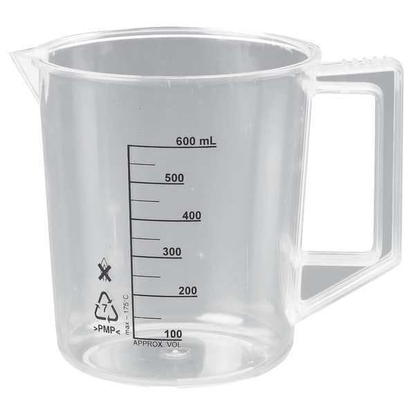 Beaker, Capacity - Metric 600 mL, Capacity - English 16.91 fl oz, Product Type Beaker, Beaker Type Low Form with Handle, Outside Diameter - Metric 109.5 mm, Overall Height - Metric 125 mm, Body Material Polymethylpentene, Includes Graduations Yes, Glassware Class Not Rated, Body Color Clear, Graduation Increments - Metric 50 mL, Autoclavable Yes, Clarity Transparent, Basic Material Plastic, Special Features Low Form has Increased Stability, Printed Graduations, Disposable/Reusable Reusable