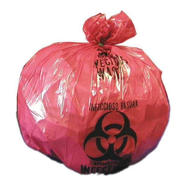 Biohazard Bags, Capacity 10 gal, Trash Bag Material LLDPE, Thickness 1.05 mil, Color Red, Bag Closure Type None, Width 23 in, Height 24 in, Max. Load 83 lb, Bottom Seal Type Star, Scent Fragrance Free, Legend Biohazard Symbol, Package Configuration Flat Pack, Bags per Roll Not Applicable, Rolls per Package Not Applicable, Item Biohazard Bags, Package Quantity 500
