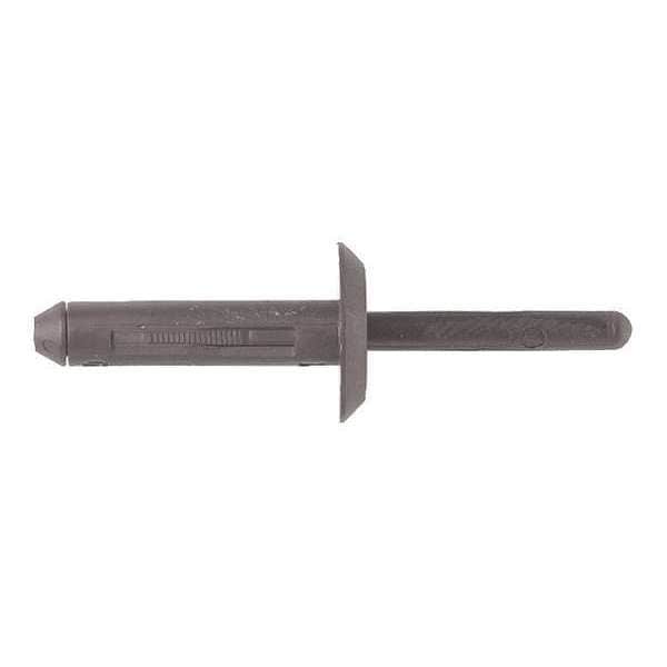 Blind Rivet,1/4 in dia,PK25, System of Measurement Inch, Body Length 1 1/8 in, Shank Diameter 0.25 in, Product Type Blind Rivet, Body Material Nylon, Head Type Dome, Head Diameter 21/32 in, Maximum Hole Diameter 0.25 in, Minimum Material Thickness 5/16 in, Maximum Material Thickness 13/32 in, Material Grade/Class Ungraded, Mandrel Material Nylon, Color Black, Package Quantity 25