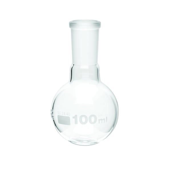 Pack of six round-bottom boiling flasks with 100ml capacity and ground glass joints (24/40). Made from low-expansion borosilicate glass, these flasks feature uniform wall thickness for superior mechanical strength and shock resistance.