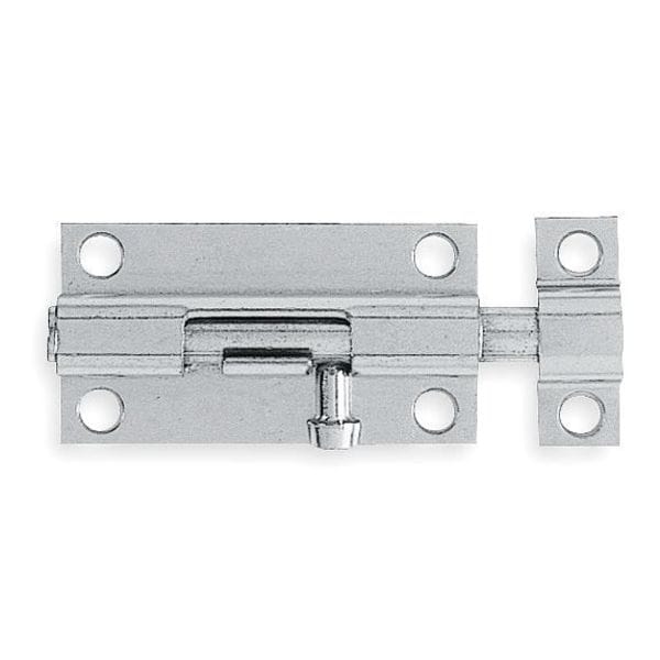 Door Bolt, Operation Type Hand Pull, Zinc Finish, Material Zinc, Length 4 in, Width 1 5/8 in, Height 2/3 in, Bolt Length 4 in, Bolt Head Dia. 13/32 in, Throw Size 1 in, Chain Length Not Applicable, Holes per Leaf 8, Hardware Included
