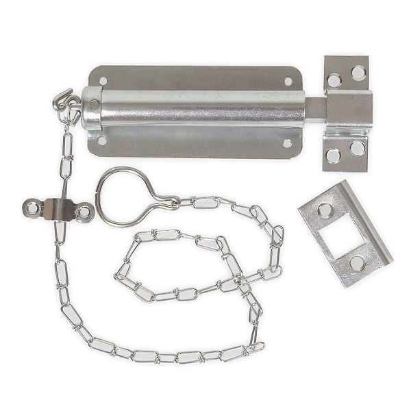 Door Bolt, Operation Type Hand Pull, Zinc Finish, Material Zinc, Length 6 in, Width 2 in, Bolt Length 6 in, Bolt Head Dia. 9/16 in, Throw Size 11/16 in, Chain Length 24 in, Holes per Leaf 6, Hardware Included