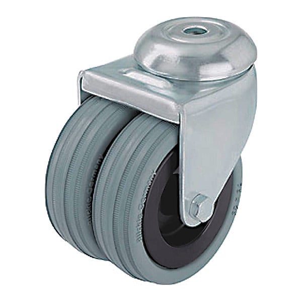 Bolt-Hole Caster, 3/8 in Bolt Hole Dia., 3/8 in Mounting Bolt Dia., Steel Caster Frame Material, Zinc Plated Frame Finish, 0 to 299 lb Load Rating Range, 150 lb Load Rating, 2 Number of Wheels, Plain, 2 7/10 in Mounting Height, 2 in Wheel Dia., 3/4 in Wheel Width, Rubber Wheel/Tread Material, 80 Shore A Wheel/Tread Hardness, Soft, Yes Non-Marking